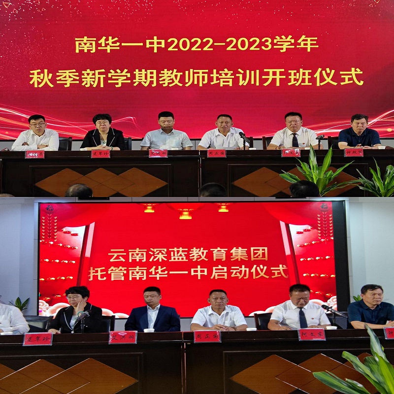 仪式上,逯翠珍校长代表云南深蓝集团作了托管后派名校长、名教师全面参与管理、教学,全面提升教学质量,并力争实现南华一中进入全州优质高中行列的表态发言;周正国局长作了题为《喜迎二十大,奋进新征程,团结一致向前看,努力实现南华一中新发展——新教材、新高考、新南中、新理念、新起点、新征程》的讲话,充分肯定了南华一中示范班取得的成绩,勉励教师们不断更新观念,不断练就真本领,燃起新希望,静待花开,开启新征程,实现新发展,力争新突破;阿文东校长作了欢迎深蓝集团托管,继续精诚团结,深度融合,提高质量,并依托深蓝集团教育优势资源全力做好本次教师培训的表态发言。