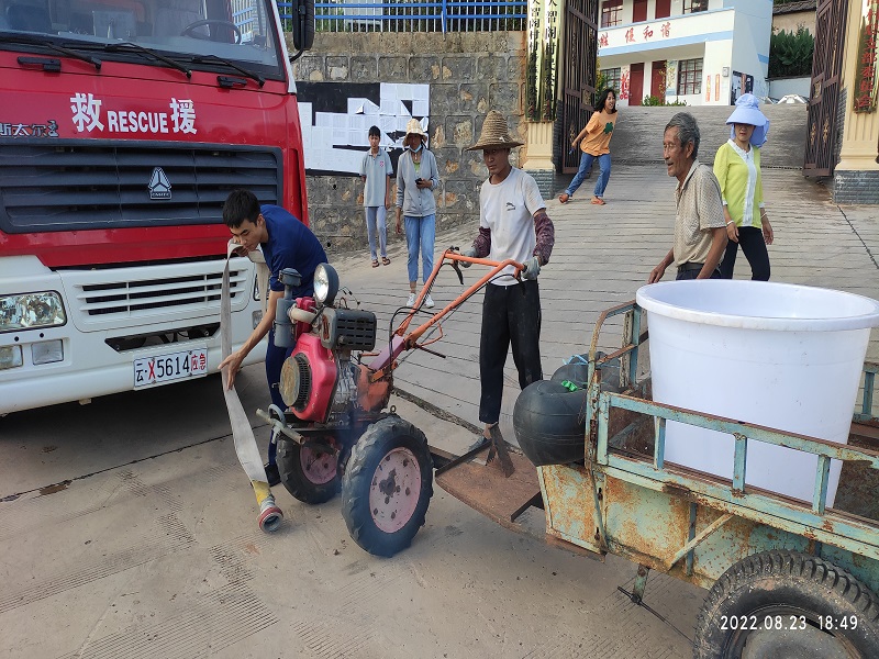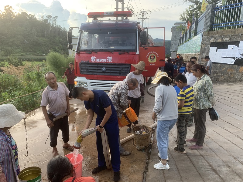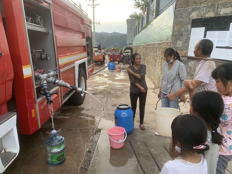 8月23日,南华县消防救援大队接到龙川镇大智阁村委会工作人员求助,部分群众的生活用水、牲畜饮水受到影响,急需用水。接到求助电话后,大队立即出动装运饮用自来水的消防车前往大智阁村委会送水。