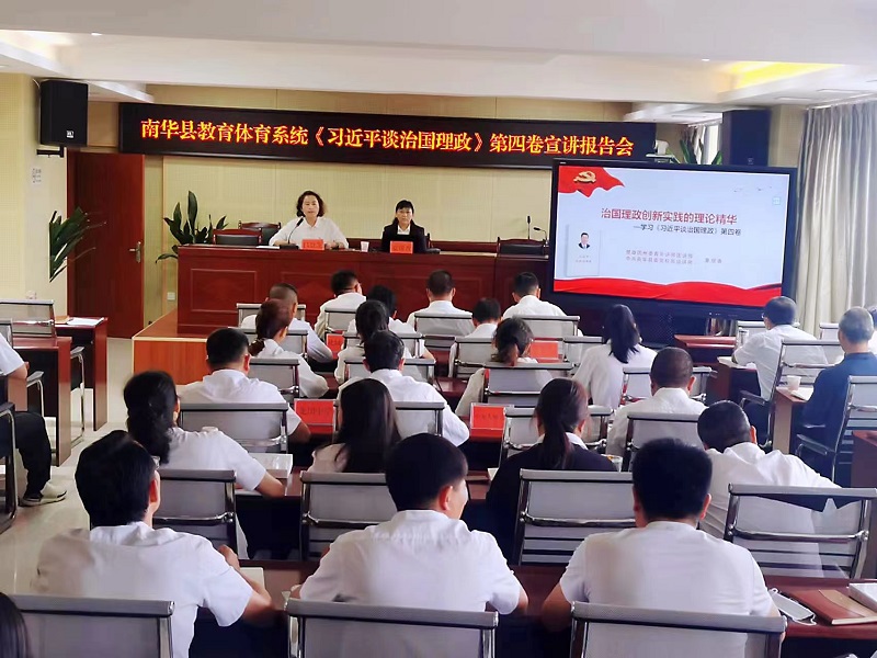 为进一步增强教育体育系统干部教师队伍的政治素养和理论水平,持续推动学习贯彻习近平新时代中国特色社会主义思想和习近平总书记考察云南重要讲话精神走实走深,9月2日上午,南华县教育体育系统开展《习近平谈治国理政》第四卷宣讲报告会,报告会邀请县委党校高级讲师夏银香作专题宣讲。县教育工委、县教育体育局党政班子成员,城区学校党总支(支部)书记、校(园)长、局机关全体干部职工共计70余人参加会议。