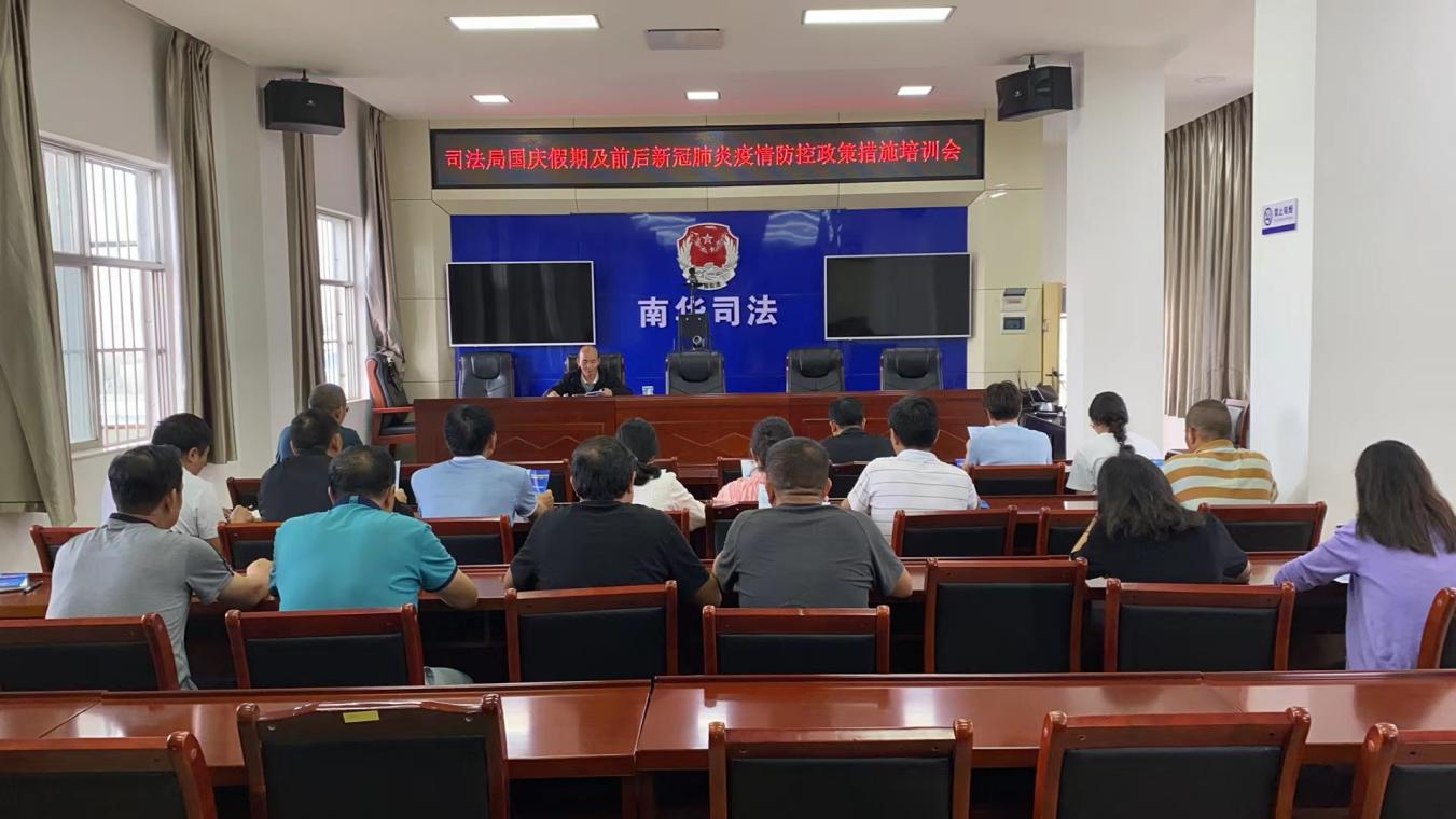 当前国庆将至,为做好节假日期间疫情防控工作,保障人民群众身体健康,进一步强化当前疫情防控形势下司法行政系统干部职工自我防护意识,提升队伍疫情防控能力,夯实疫情防控工作基础,9月20日上午,南华县司法局组织全局干部职工开展疫情防控知识暨2022年国庆假期及前后防控政策措施专题培训。