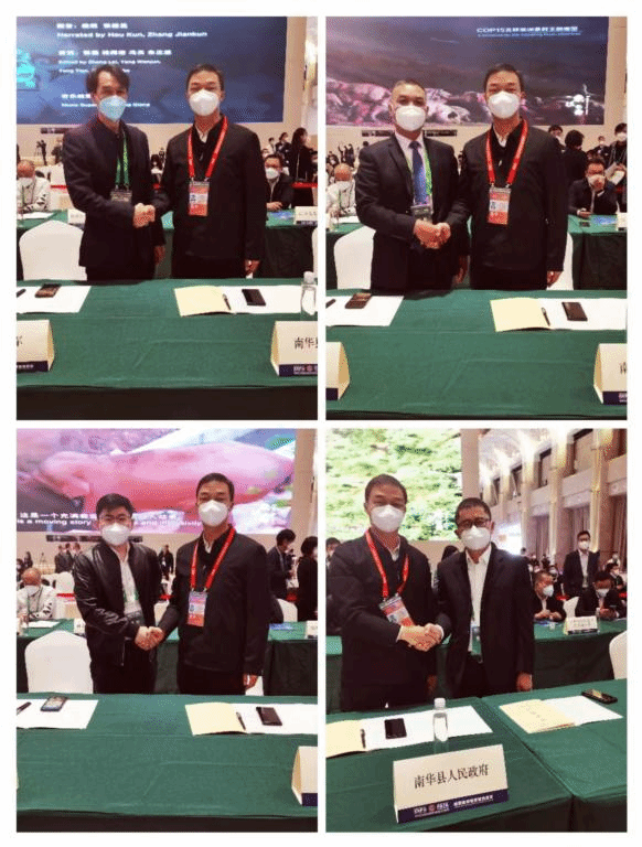 南华县人民政府副县长张建海代表县人民政府分别与4家企业代表签订南华两旗海湿地公园开发建设项目,农牧产业链项目,农业节水灌溉产品及废旧薄膜、滴灌带回收造粒生产线建设项目和年产20万吨饲料生产线建设项目等4个项目,协议投资总额7.8亿元。