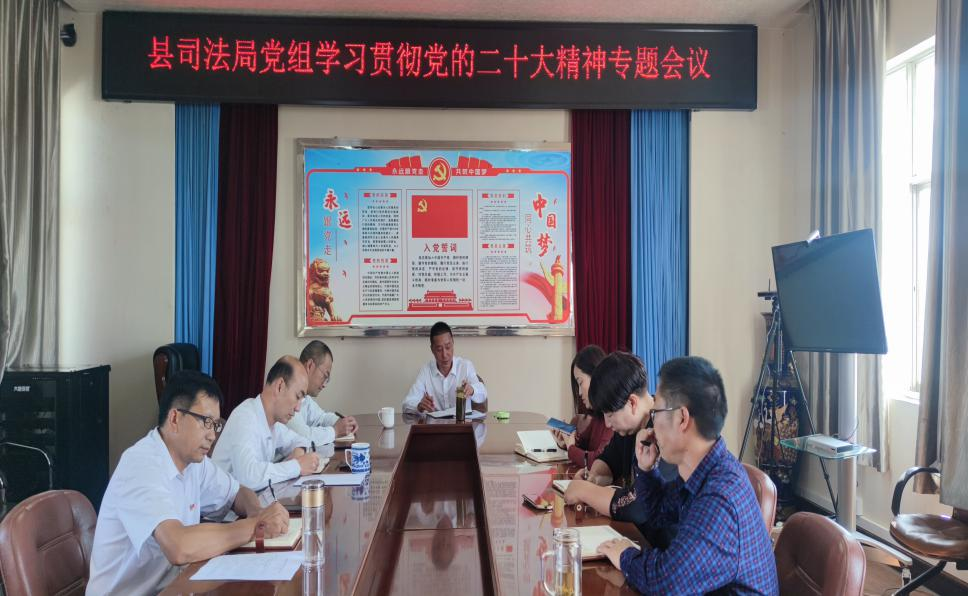 司法局党组把第一时间组织全局党员干部集中收听收看党的二十大开幕会盛况,及时召开理论学习中心组会议,专题传达学习党的二十大精神,安排部署司法行政系统贯彻落实具体要求,班子成员结合党的二十大报告专章部署的“坚持全面依法治国,推进法治中国建设”这个新时代新征程中的战略任务,立足司法行政机关“一个统筹、四大职能”,深入学习领会,自觉把深刻领悟“两个确立”的决定性意义、坚决做到“两个维护”落实到深入推进全面依法治县和司法行政工作高质量发展的实际行动中,做到先学一步、学深一层,以身示范。