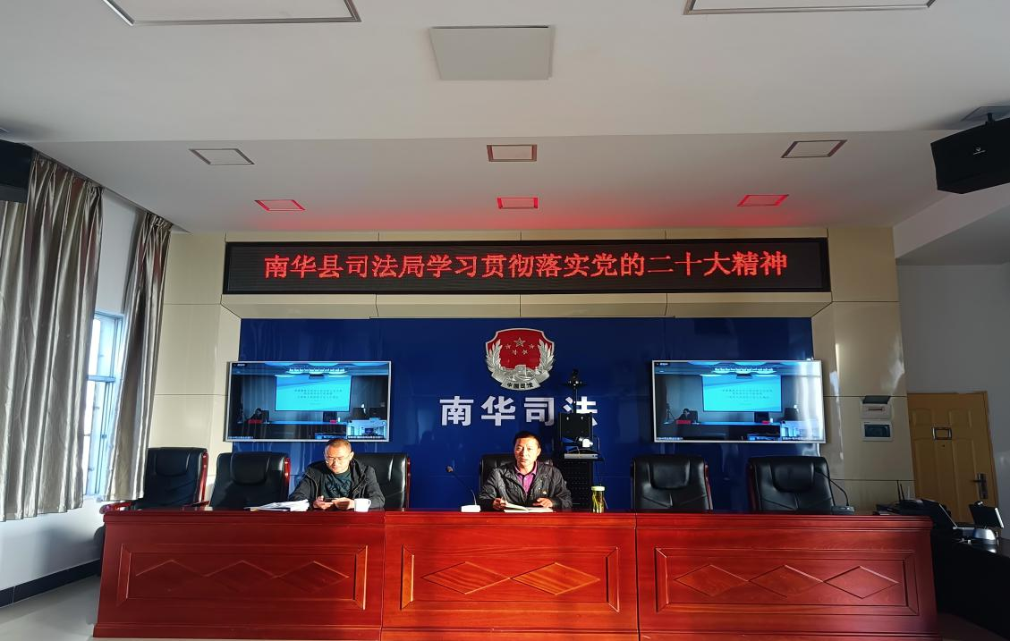 南华县司法局党组坚持把学习宣传贯彻党的二十大精神作为全县司法行政系统当前和今后一个时期的首要政治任务,紧扣中央、省州县党委和省司法厅关于学习贯彻党的二十大精神系列部署要求,精心组织,周密安排,坚持领导干部领学,支部集中学,党员干部个人学,确保切实抓好党的二十大精神的贯彻落实,有力推动了党的二十大精神在南华县司法行政系统走深走实,持续推进司法行政工作的创先争优,跨越发展。