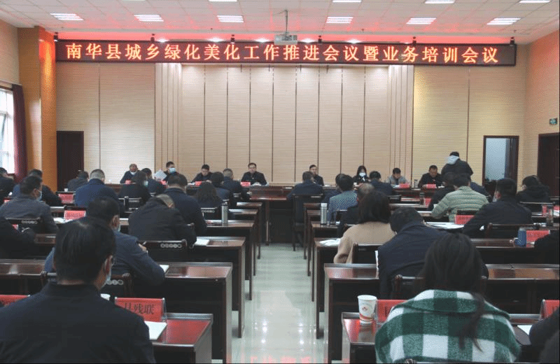 2022年12月8日上午,南华县在公务中心一楼中型会议室召开全县城乡绿化美化建设工作推进会议暨业务培训会议,会议在乡镇设分会场。