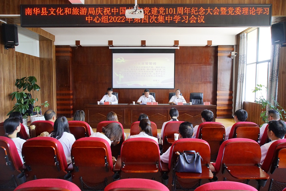 百年征程波澜壮阔,百年初心历久弥坚。6月30日,南华县文化和旅游局召开庆祝中国共产党成立101周年暨党委理论学习中心组2022年第四次集中学习会议,认真回顾了中国共产党建党101周年以来波澜壮阔的光辉历程,缅怀了中国共产党建党101周年的丰功伟绩,动员和号召局属各级党组织和广大党员干部坚定理想信念,牢记历史使命,提振干事创业精气神,在工作节奏上加速、在解决问题上提速、在质量要求上提标,以新时代新担当新作为谱写南华文化和旅游高质量发展新篇章。