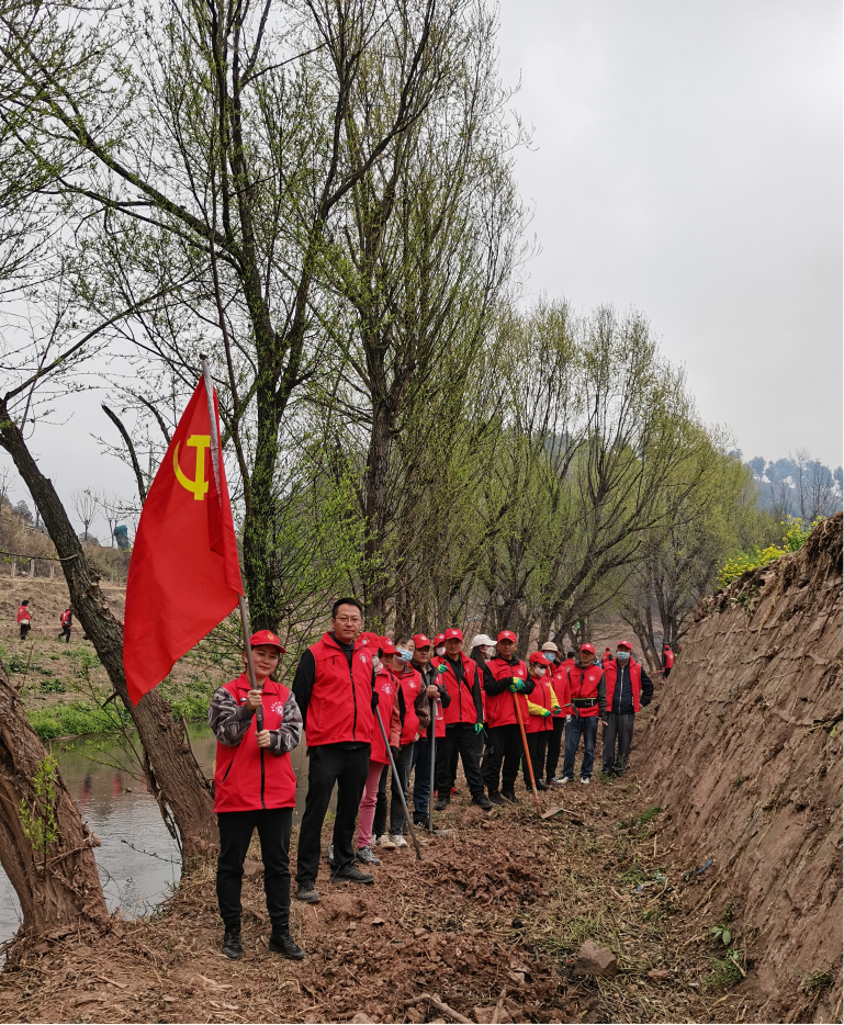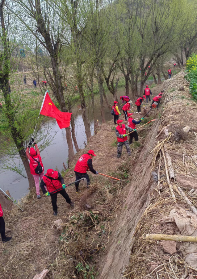 活动现场,鲜艳的党旗迎风飘扬,党员干部干劲十足、热火朝天,手拿镰刀、锄头、铲子等工具,对河道内的水面漂浮物进行打捞,清运沿岸乱堆垃圾,清除枯木杂草根枝,确保做到河面无漂浮物、河中无障碍、河岸无垃圾。