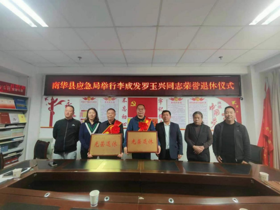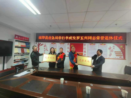 为表达对退休干部的深切敬意,增强退休干部的归属感、荣誉感和幸福感,激励在职在岗同志勇立潮头、接续奋斗。阳春三月,春暖花开。在这温暖的季节里,在这喜悦的日子里,3月17日下午,南华县应急管理局以最真挚的情谊为李成发、罗玉兴两位退休干部举行荣退仪式。