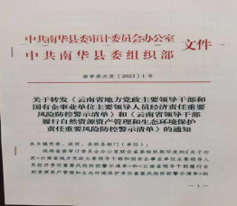 为切实做到领导干部经济责任和自然资源资产管理及生态环境保护责任重要风险有效防控,推动审计效能由“事后监督”向“事前预防”提升,近期,南华县审计局积极采取各种形式学习宣传贯彻《云南省地方党政主要领导干部和国有企事业单位主要领导人员经济责任重要风险防控警示清单》和《云南省领导干部履行自然资源资产管理和生态环境保护责任重要风险防控警示清单》。一是主动向同级审计委员会报告制定两个清单的背景和意义;二是向各乡镇党委政府、县级各部门转发了两个清单并要求学习宣传贯彻落实;三是利用开展审计工作机会,在审计项目进点会上向相关单位宣传清单内容和出台背景;四是组织审计人员对清单展开全面、深入、系统的学习,提升学习成效,学以致用。