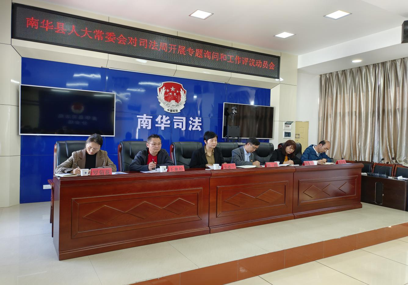 朱必兰副主任对专题问询和评议工作提出三点要求:一要提高政治站位,深刻认识开展专题问询和评议工作的重要意义。开展专题问询和评议工作是人大加大监督力度、提升监督实效的重要手段,是促进政府工作部门依法行政、改进工作的有效方法,是对司法行政工作的促进和推动。二要把握总体要求,确保专题问询和评议工作取得实效。要明确评议的目的、内容、主体、标准、要求,按照计划和步骤深入细致地开展相关工作,确保达到预期目标。三要加强组织领导,县司法局要强化组织领导、认真对待,要全力配合支持开展好专题问询和评议工作。在工作中要加强沟通、相互配合,正确把握、促进发展,努力把我县的司法行政工作提高到新的水平,为建设法治南华、平安南华作出新的更大的贡献。