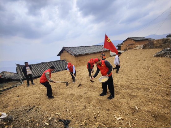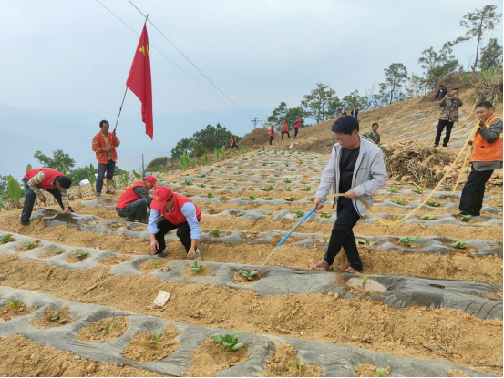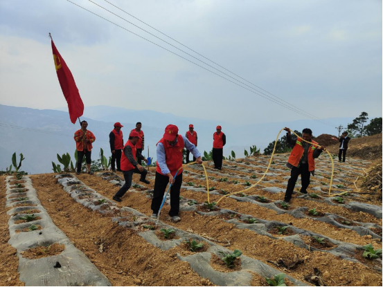 志愿者们深入大德郎村委会田间地头,义务帮助农户开展春耕备耕工作。活动现场,“红马甲们”劳作热情高涨、斗志昂扬,积极主动下田地,帮助村民种植烤烟、播种玉米。大家齐心协力、分工合作,和村民一起平整土地、挖沟撒种、浇水施肥,忙碌的身影穿梭在田间地头,个个争当“红色先锋”。党旗高高飘扬在春耕一线,党徽在阳光下熠熠生辉,田间地头处处都是春耕的繁忙景象,“志愿红”和“春耕绿”勾勒出一幅生机勃勃的美好画卷。