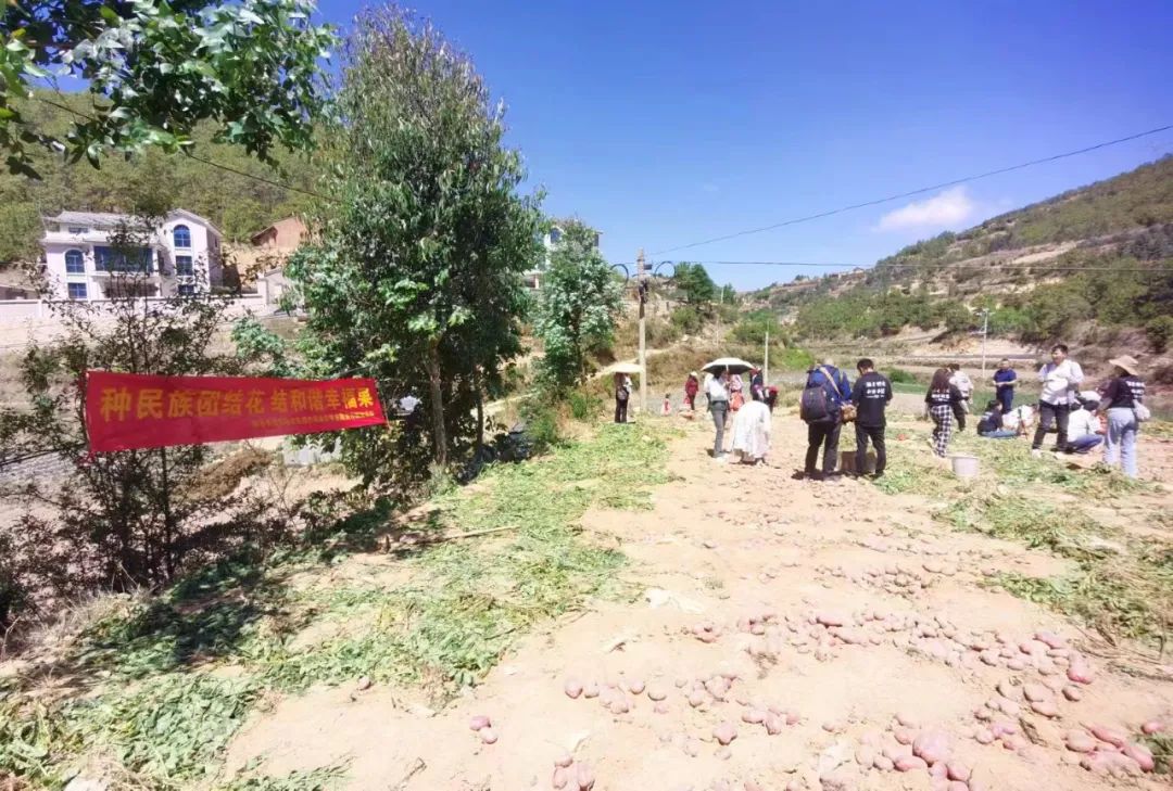 南华县沙桥镇于栖么村依托自身资源优势,积极引导农户发展洋芋产业,种植洋芋1000余亩,被州级命名为“一村一品”种植示范村。通过开展“洋芋花开促团结·同心共育幸福果丨南华县铸牢中华民族共同体意识主题宣传教育活动”,举办民族团结进步知识竞赛、非遗文化展示、摄影大赛、拔河大赛、挖洋芋、吃洋芋、捉鸭子、捉鱼、展览展销、美食品鉴等活动,全方位、立体式地展现南华特色资源优势和独特的民族风情。