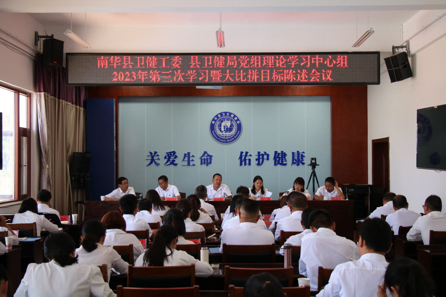 为深入贯彻落实州县“四向发力”推进作风革命效能革命的具体要求,进一步总结成绩、交流经验,查找差距,着力解决大比拼我们要拼什么、怎么拼,引导全系统干部职工不断凝聚“干在实处、走在前列”大比拼的强大合力,全力推动全县卫生健康系统2023年工作作风大转变、效能大提升、发展大跨越。5月29日上午,中共南华县卫生健康工作委员会、南华县卫生健康局党组理论学习中心组召开2023年第三次学习会议暨大比拼目标陈述会议。会议由县卫健工委书记、局党组书记、局长何育胜主持,县卫健工委、县卫生健康局领导班子成员,局机关各股室负责人及全体党员,全县各卫生健康单位党政主要领导,民营医院党支部书记、院长共60余人参加会议。