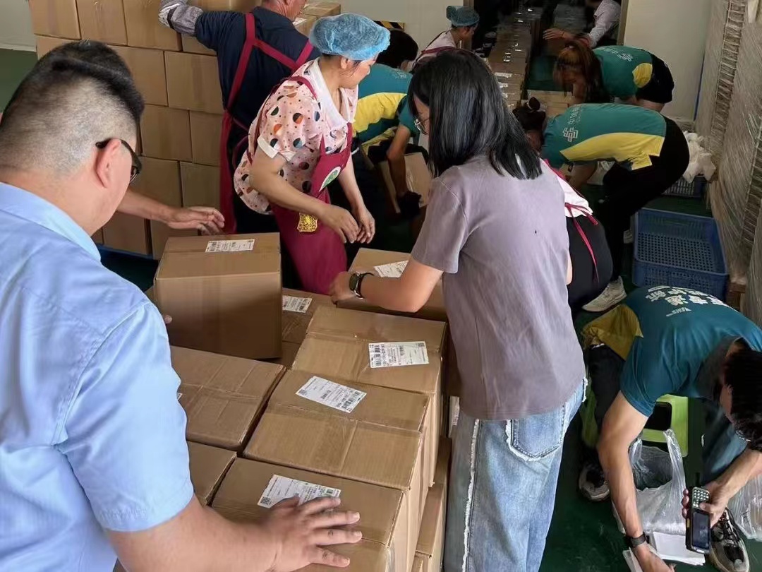 “货太多,叉车都用上了。这个天气热的不行,但却丝毫不影响我们干活的进度。奋战一个月,今天大货车走2车。”正在备货的一名工作人员说。