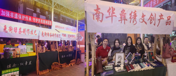 此次展演展示活动异彩纷呈,分别组织了《镇南月琴》《根雕(楚雄根雕)》《阳麦粑粑制作技艺》《兔街绿茶制作技艺》《南华彝绣文创产品》等省级、州级、县级非遗项目进行展示展销。雨露白族正月灯调演唱、彝族古歌演唱《六祖古歌》、彝族古歌对唱《六祖归来》、彝族小调《山坡上放羊》《阿苏者跳歌调》《白族大刀舞》等非遗节目展演将整个活动推向高潮,为广大群众带来了一场精彩的文化大餐。活动现场文化志愿者发放了非遗宣传资料,弘扬守护文化遗产、传播非遗价值的主旋律和正能量,让广大群众近距离了解南华非遗,感受中华优秀传统文化魅力,共享非遗之美,共助非遗传承。