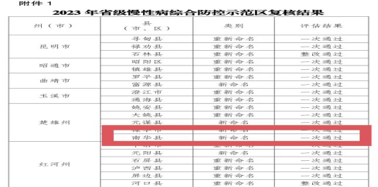 近日,从云南省卫健委办公室《关于命名和重新确认省级慢性病综合防控示范区的通知》中获悉,南华县确定并命名为省级慢性病综合防控示范区,标志着南华县省级慢性病综合防控示范区创建成功。