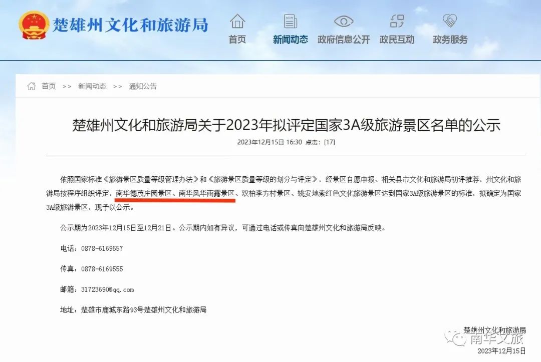 12月15日,楚雄州文化和旅游局发布2023年拟评定国家3A级旅游景区名单公示,全州4家景区进入公示名单,南华德茂庄园景区、南华风华雨露景区榜有名!