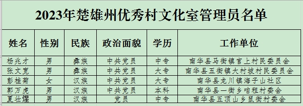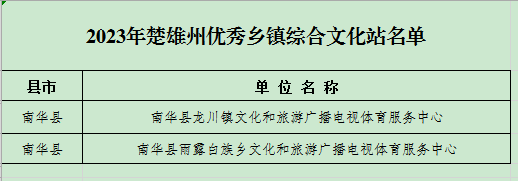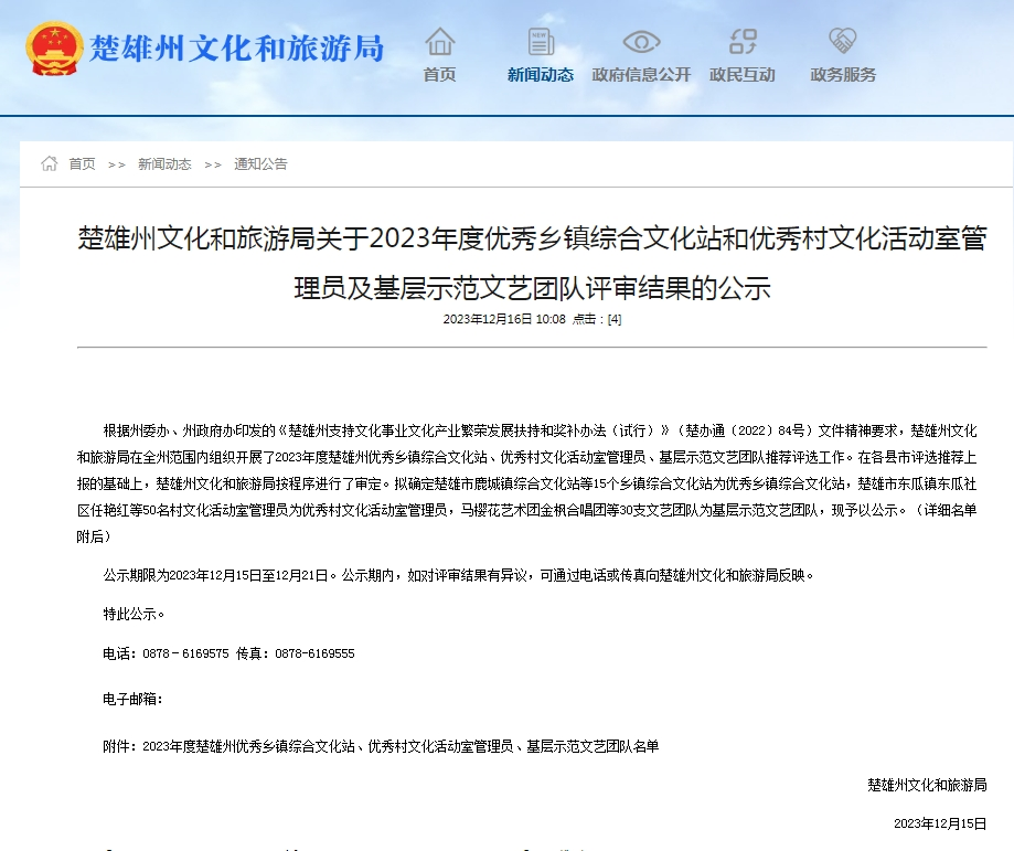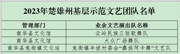 12月15日,楚雄州文化和旅游局发布2023年度优秀乡镇综合文化站和优秀村文化活动室管理员及基层示范文艺团队评审结果公示,南华县2个乡镇综合文化站、5名村文化活动室管理员及3支基层示范文艺团队榜上有名!