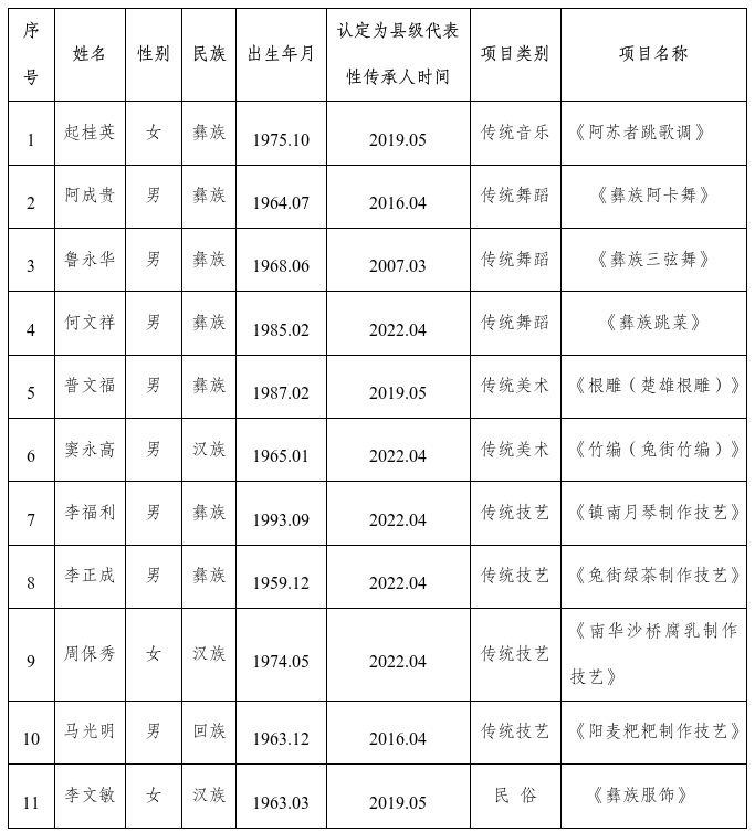 楚雄州南华县第六批州级非物质文化遗产代表性传承人公布人员名单(共11人)