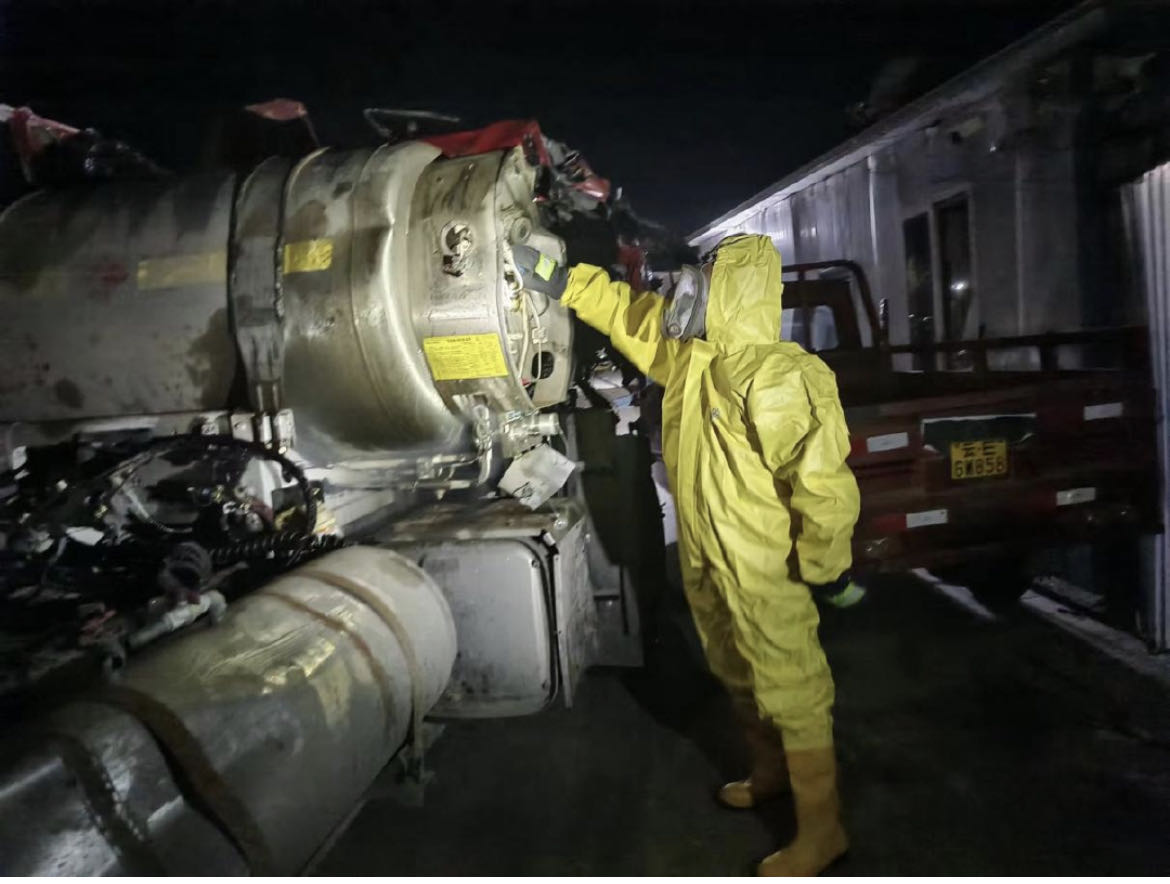 ——有条不紊,保障安全显专业。现场清理完毕后,应急救援大队对天然气罐体进行一系列排压处理,降低罐内压力。牟定县消防救援大队在车辆、罐体周边喷洒水雾,防止天然气扩散并降低天然气浓度,降低天然气爆燃的风险。经过2个多小时紧张有序的救援,车辆天然气罐内的天然气全部安全排除,同时使用空气污染物含量检测仪对现场空气成分进行检测已符合标准,彻底消除安全隐患。随后该公司应急救援大队大队长向现场领导报告救援结束,接到收队指令后,各部门有序撤离事故现场。事故发生第二天凌晨00:55周边生产生活秩序恢复正常。