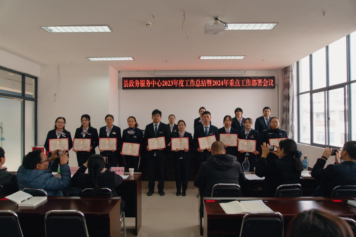 会上,对2023年窗口被投诉;年度考核测评结果和推优上报人员;派驻人员出勤;各窗口办件量和四个季度评比“争做先锋当表率”和“工作之星”评选情况作了通报。对2023年涌现出的4个“优质服务先进集体”和11名“优秀服务标兵”作了表扬,并颁发了奖杯和荣誉证书。获奖代表作了交流发言。