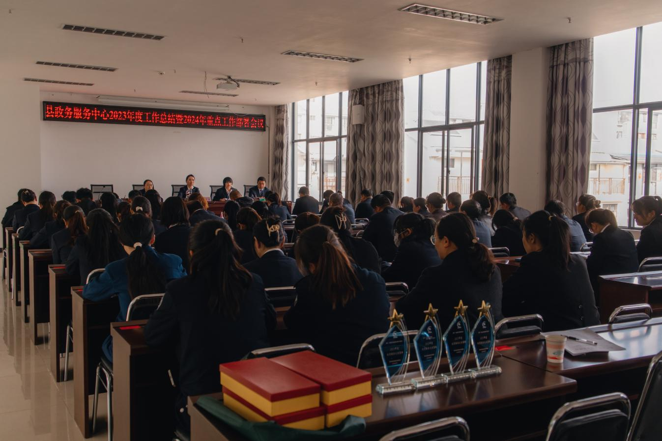 2月23日下午,南华县政务服务管理局召开县政务服务中心窗口工作会议,全面总结2023年县政务服务大厅窗口工作,部署谋划2024年窗口工作,动员全体政务人以“开年就是开工、开工就要实干”的奋进姿态,跑出比学赶超“加速度”,为活力南华、温暖南华、魅力南华、幸福南华的明天更加美好团结奋斗、努力奋斗。县政务服务局班子成员及市场服务股、政务服务股,派驻单位5人以上分管领导和全体派驻工作人员共120余人参加会议。