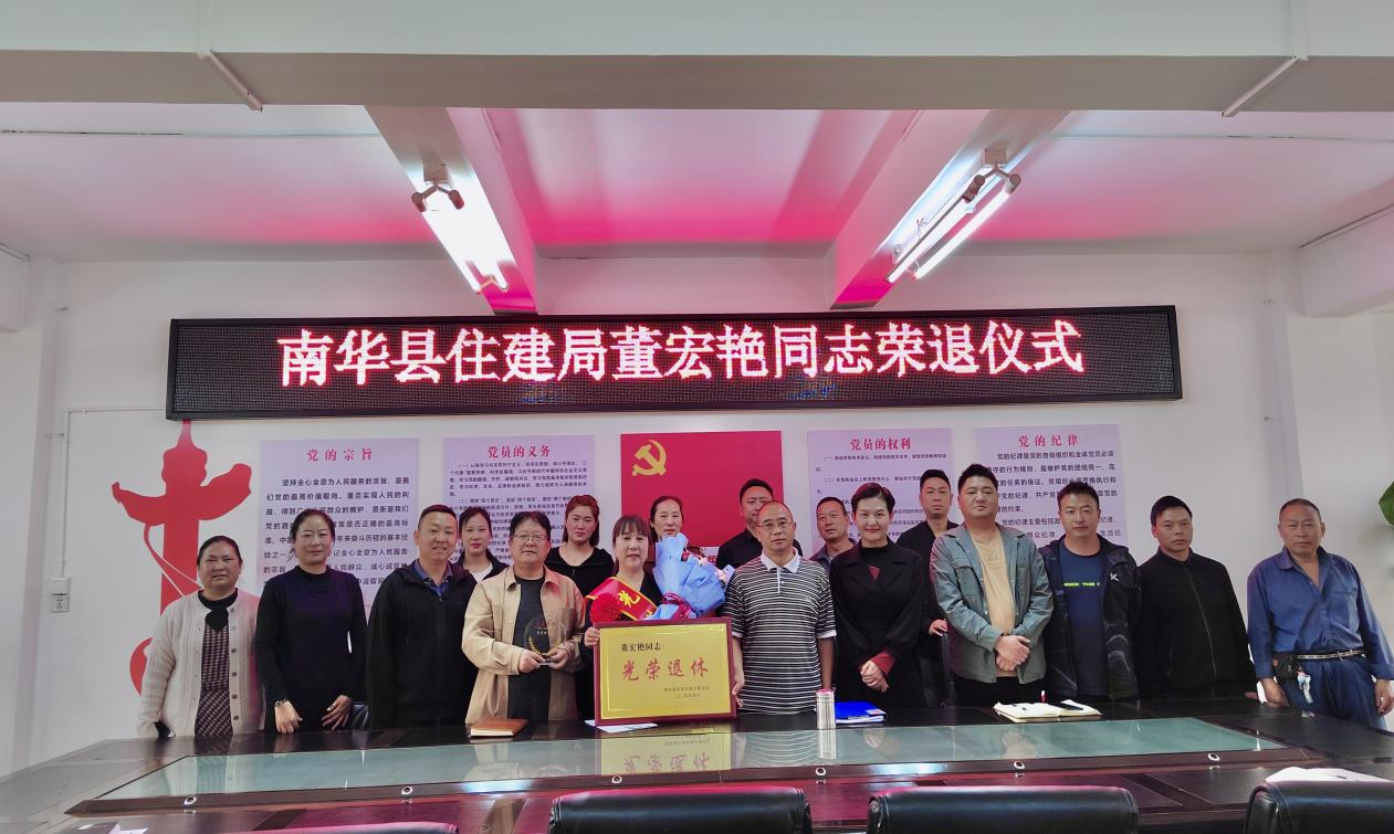 为全面落实习近平总书记关于老干部工作的重要论述,充分展现对退休职工的崇高敬意和关心厚爱,增强退休干部的荣誉感、归属感、幸福感,激励广大干部传承优良作风,近日,南华县住建局为到龄退休的环卫站副站长董宏艳同志举行荣退仪式。县住建局班子成员、环卫站部分同志参加荣退仪式。