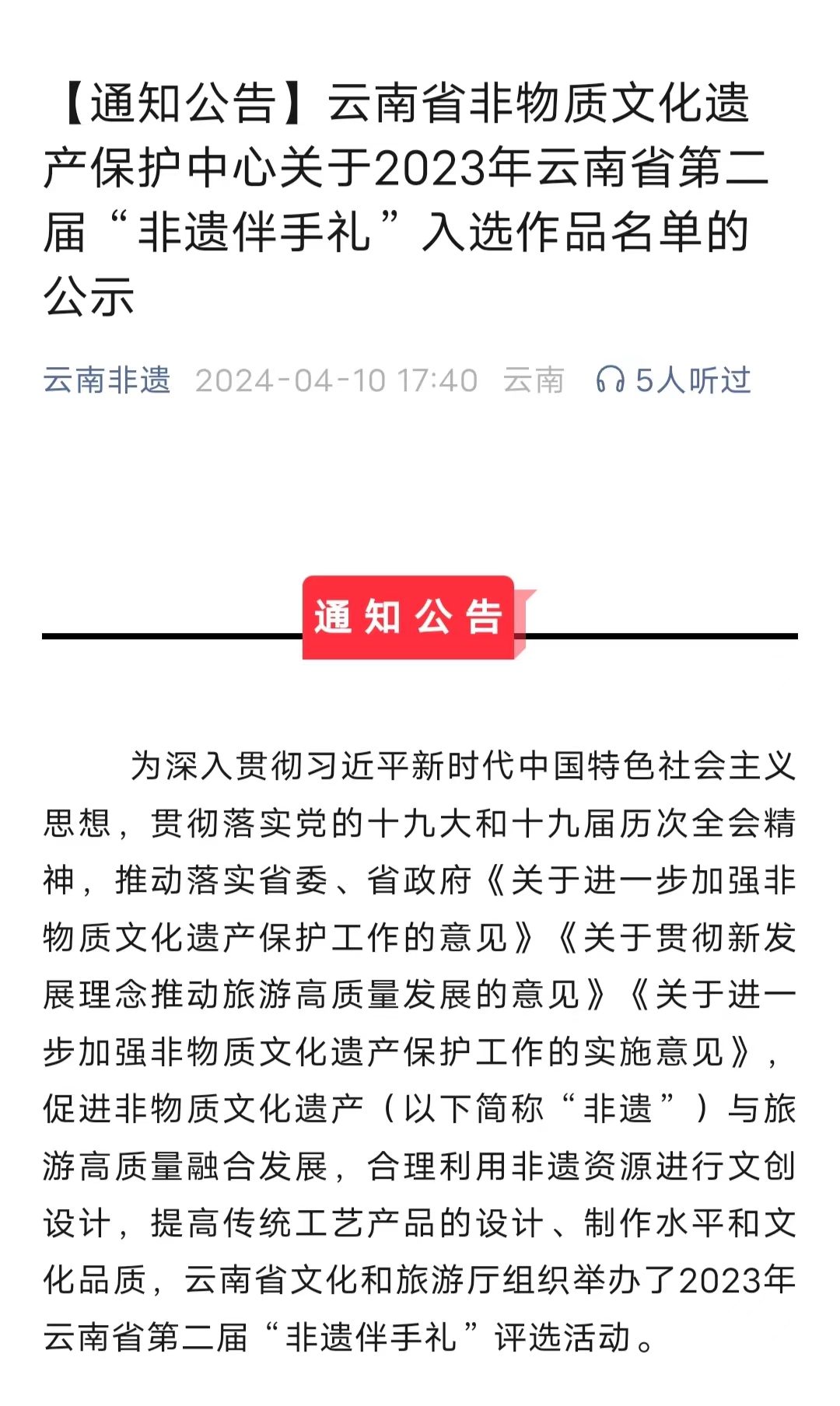 4月10日,云南省非物质文化遗产保护中心发布2023年云南省第二届“非遗伴手礼”入选作品公示名单,我县3件非遗作品拟入选,也是楚雄州唯一在此次评选活动中榜上有名的作品。