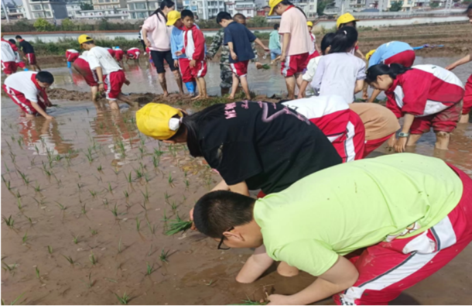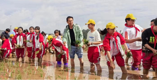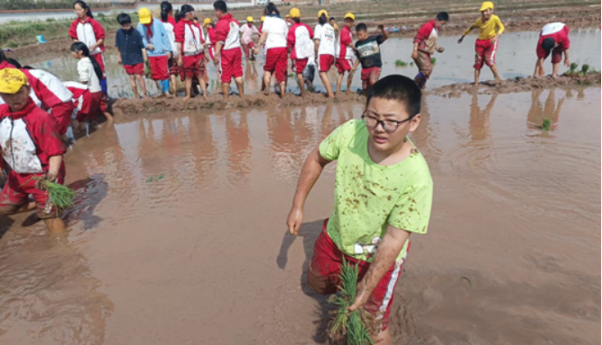 最后,同学们一个个变成了泥娃娃,泥水沾满了衣服和红领巾,但仍忙得不亦乐乎,他们边插秧边齐声唱着“我是一个农村人”、“大香蕉”等歌曲,欢声笑语、歌声、嬉戏打闹声充满了整个田间地头,成了今夏田间最美的声音和风景,也是丰收在望的最美乐曲。