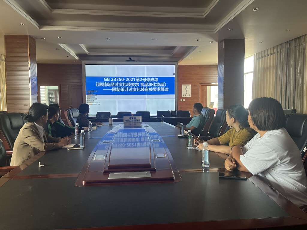 视频会议结合当前我省实际从三个方面开展:一是理论知识培训,详细讲解了第2号修改单的主要内容:包装层数、包装成本、商品包装质量、商品必要的空间系数、商品包装质量计算方法、标准实施要求等内容;二是案例分析,通过实际案例讲解分析了近两年我省过度包装的典型案例,把执行情况和相关的法律条文贯穿在案例中;三是下步工作安排,省局对贯彻GB 23350—2021《限制商品过度包装要求食品和化妆品》第2号修改单,进一步规范茶叶包装做了安排。