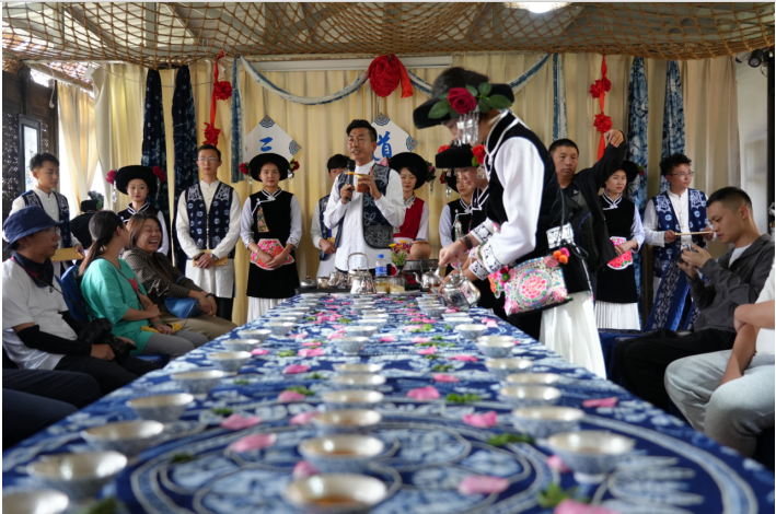 在阿呀噜田园农庄,各位媒体记者和网红达人在工作人员的讲解下,观看白族大刀舞和打跳表演,体验白族非遗扎染,品茗雨露白族三道茶,从热情奔放的民族歌舞到庄重有礼的敬茶仪式,调研团一行在舌尖的苦、甜、酸中感悟田园生活。