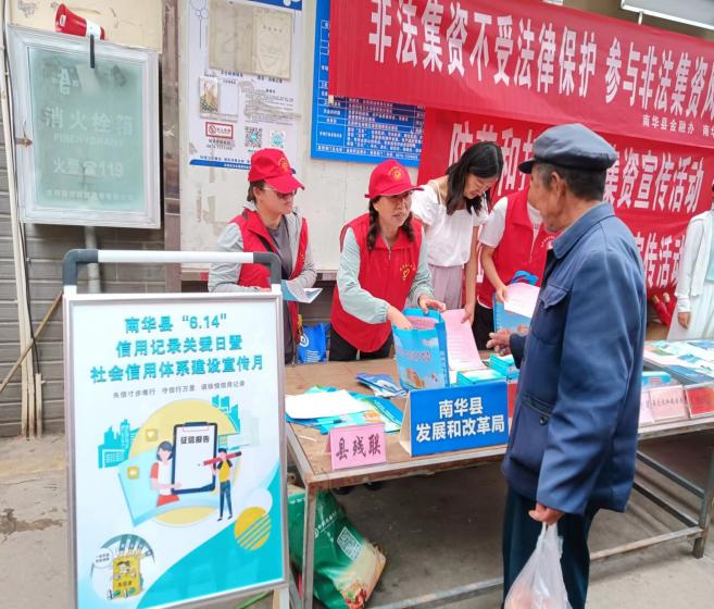 近日,在全国第十七个“6.14”信用记录关爱日,南华县发展和改革局组织各部门和银行系统深入北城农贸市场、超市、街心花园等人员密集场所,以倡导“失信寸步难行,诚信畅行万里,真爱信用记录”为主题,开展“6.14”信用记录关爱日暨社会信用体系建设宣传活动。