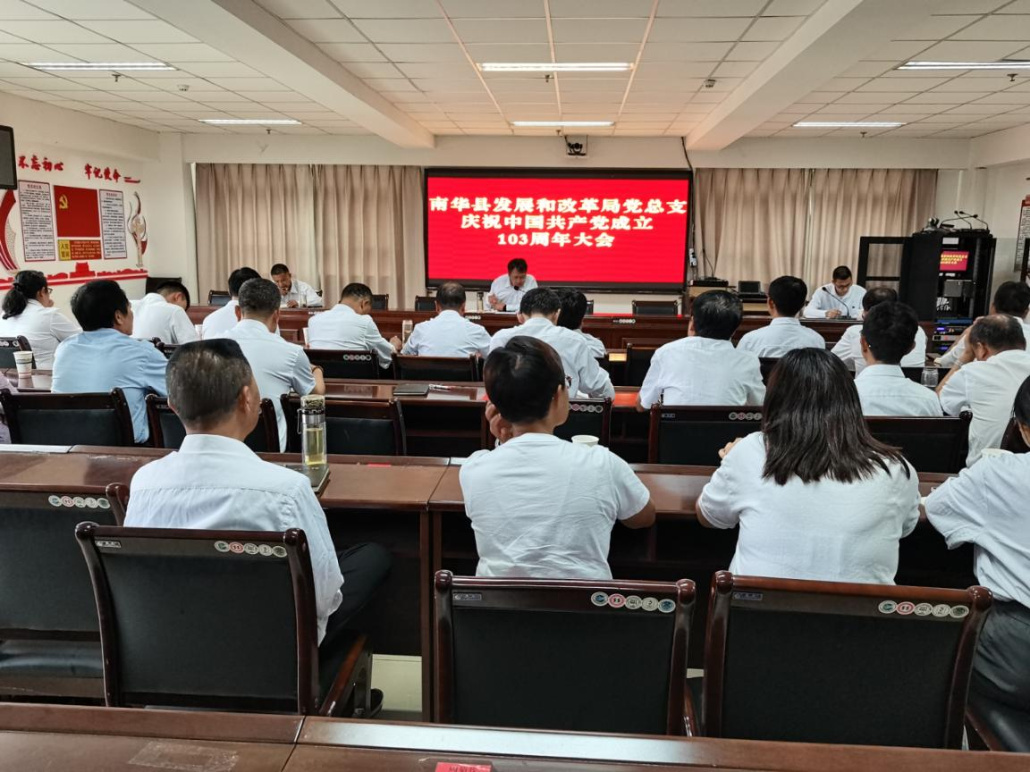 为庆祝中国共产党成立103周年,弘扬伟大建党精神,汲取强大奋进力量,奋力谱写好中国式现代化的发改新篇章,7月1日上午,南华县发展和改革局召开了庆祝中国共产党成立103周年大会,会议由局党组书记、局长马成福同志主持、局机关全体党员干部、离退休党支部部分党员参加会议。