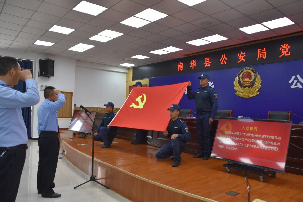 “我志愿加入中国共产党,拥护党的纲领,遵守党的章程......”南华县人民政府副县长、县公安局党委书记、局长刘培金带领党员们重温入党誓词。全体党员面向党旗,佩戴党员徽章,高举右拳,坚定有力的宣誓声,表达了对党的无限忠诚和为共产主义事业奋斗终身的庄严承诺,矢志不渝做中国特色社会主义事业的建设者和捍卫者。