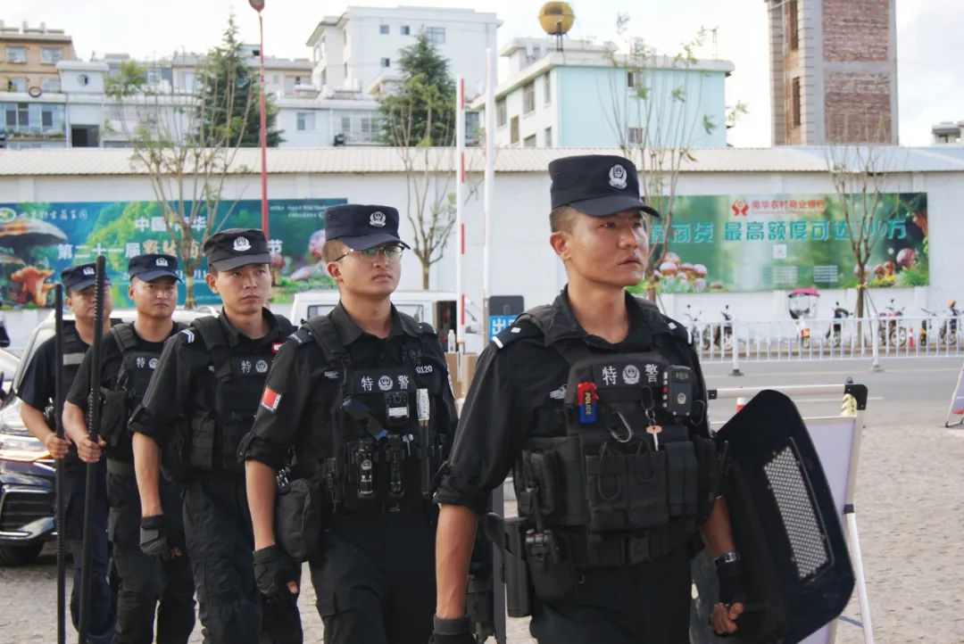 “菌子节”期间,为营造安全稳定社会环境,南华县公安局特警大队按照县局统一部署,开展武装巡逻,严格落实“1、3、5分钟”快速反应机制。针对人员密集、流动性较大的野生菌交易市场、展销会、龙泉广场3个重点部位场所采取以摩托车、徒步巡逻为主,定点警戒为辅的方式,结合实际每日投入1组9人次的骑警组加强巡逻,投入2组10人次的PTU警组值守维护周边安全秩序,投入6人次巡逻小组协助进行内场安保巡逻工作,期间协助处理遗失物品事件1起,进一步提高了警灯闪烁街面见警率,有效加强了巡逻防控措施,保障了群众出行安全、确保活动有序进行。