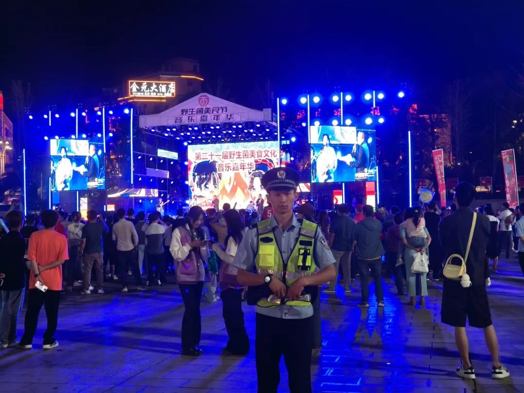 这些对群众的声声提醒,源自今年刚参加工作加入到公安大家庭的民警刘晓宏,这是他第一次参加安保,也是他第一次背对舞台参加音乐会。“南华这边的节日风俗,和我老家那边还真的不一样,这次的音乐会、万人打跳、“松茸杯”这一系列的活动都让我感觉太震撼了,也真正感受到了世界野生菌王国——南华的独特魅力和彝族人民火一样的热情。”刘晓宏是牟定人,提到南华时他对南华的初印象是这里十分热情,少数民族气息浓厚,这也引起了他强烈的兴趣。