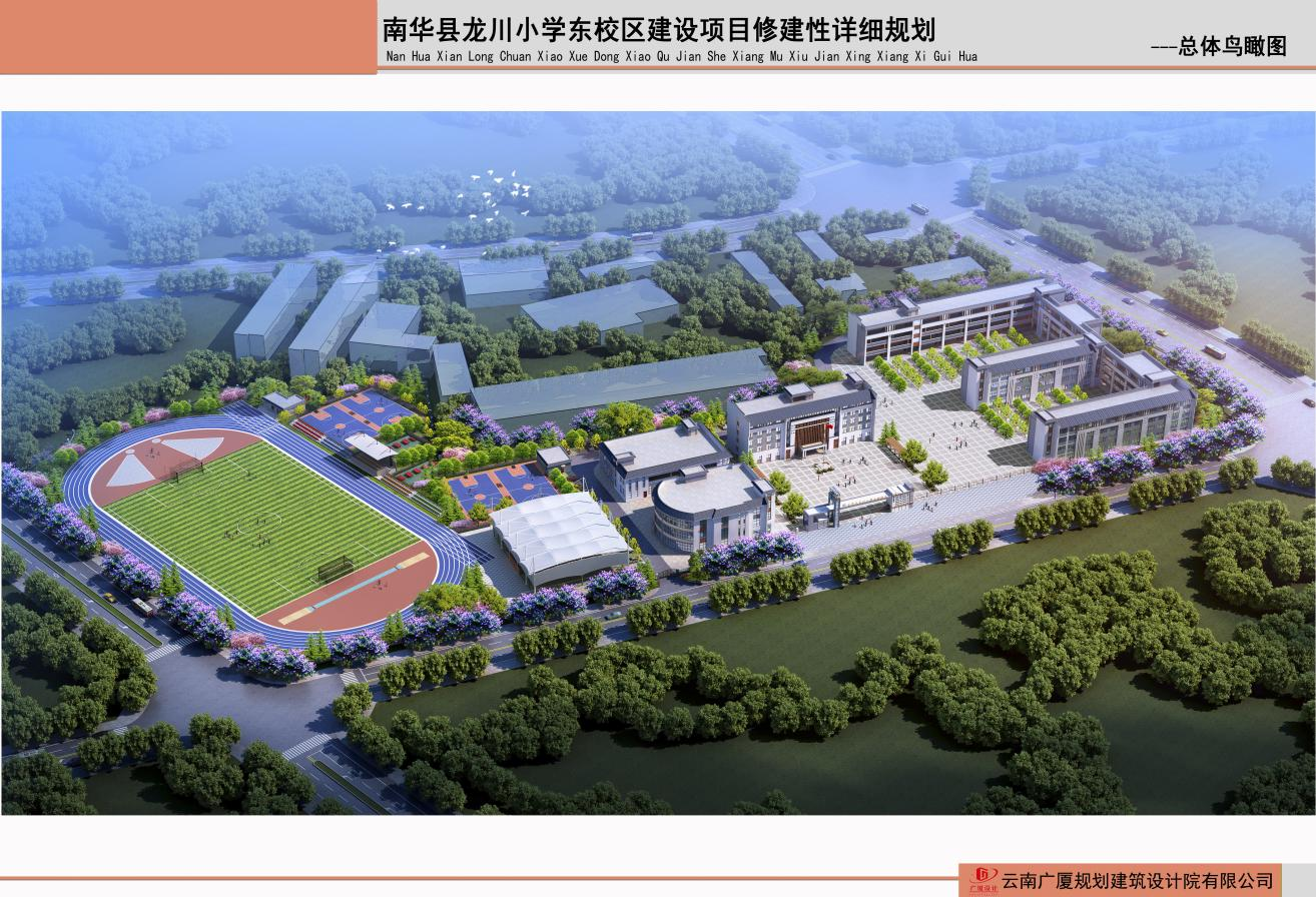 南华县龙川小学东校区建设项目位于南华县龙川镇龙川大道与广福路交叉口,项目总建筑面积72366.42平方米,新建建筑10栋5层,主体建筑面积17175.11㎡,体育运动场面积14707.92㎡,室外附属设施面积40483.39㎡。整体规划42个教学班,可容纳1890名学生,预计2025年9月建成投入使用。
