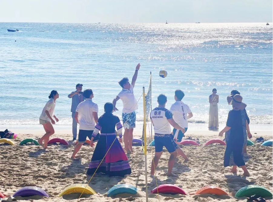 ▲香港代表团和浙江代表团运动员在海边打沙滩排球。许玲玉摄
