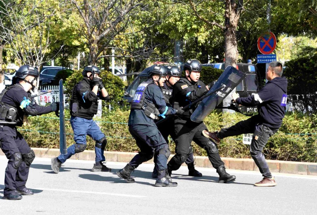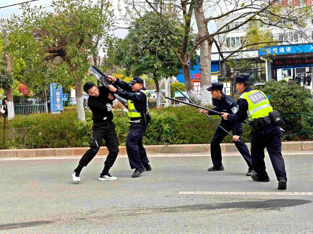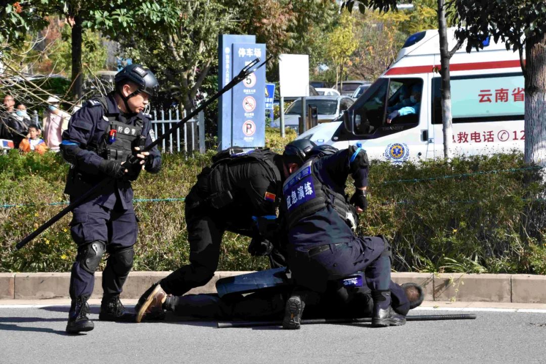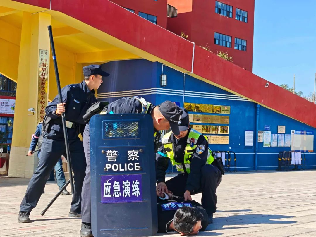 演练以南华县思源实验学校门口突发案件处置为模拟。警情发生后,南华县迅速启动社会安全守望相助“平安链”联保机制和极端案事件处置预案,学校迅速反应,拉响警铃、敲响铜锣、按下报警键,在第一时间向思源实验学校周边县人武部、县医院等单位发出求助信号,学校周边应急队伍和公安专业处突力量火速赶赴现场开展工作,突发警情得到快速有效处置。