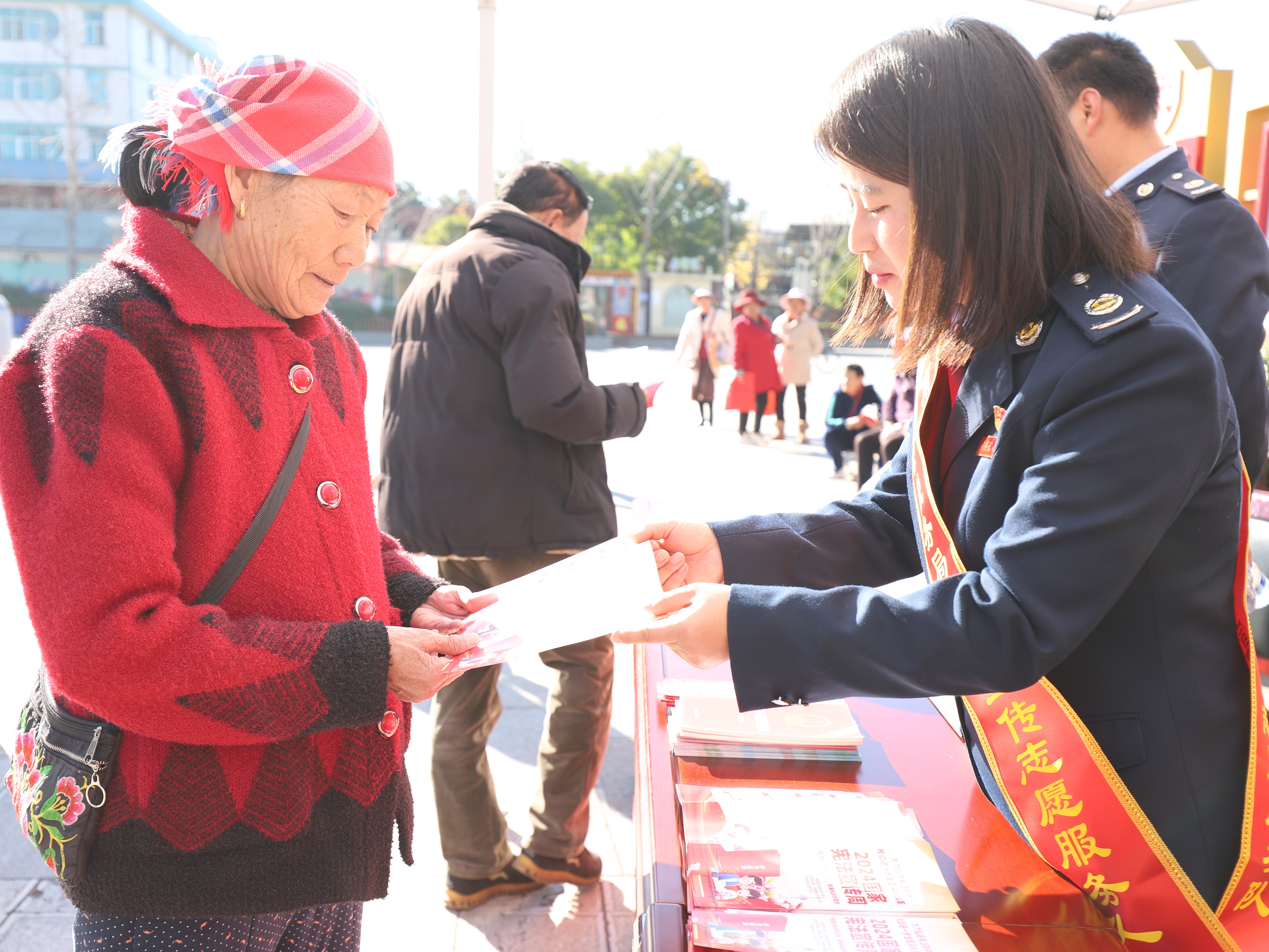 在法治文化主题广场,南华县税务局将“税宣”与“普法”相融合,组织开展宣传活动。通过悬挂条幅、竖立展板营造浓厚的宣传氛围,向现场群众发放宪法知识宣传彩页,详细讲解宪法基本知识,并结合子女教育、赡养老人以及肖像权、名誉权等实际案例,宣传宪法在日常生活中的重要作用,让大家更加深刻认识到遵守宪法是每个公民的基本义务。同时设立税务咨询台,对群众关心的各类税费优惠政策、城乡居民社保费缴纳档次标准等系列问题,给予耐心详细的讲解与回答。通过互动问答的形式,将宪法、税法知识传递给在场的每一位群众,让知法、懂法、守法意识在轻松愉悦的氛围中深入人心。“这样的宣传多接地气呀!对我们老百姓来说搞的很好,听得懂也记得牢,让我们了解了宪法知识,也增强了遵规守纪意识!”今年82岁的王大爷说道。