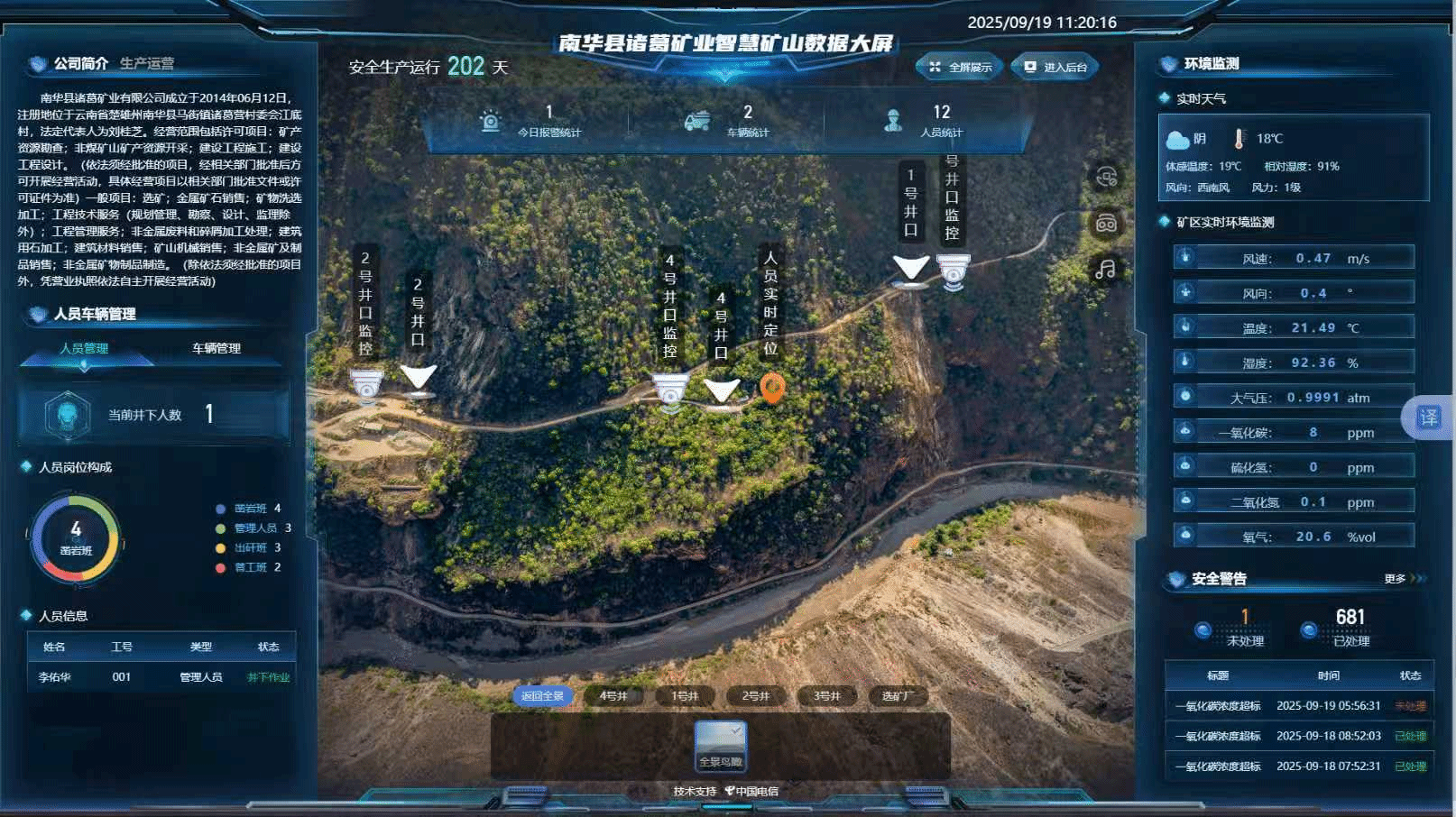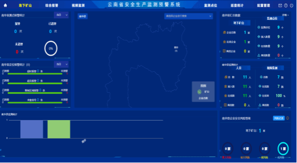 4月份智慧管理系统完成建设并投入试运行,现已将9个监测点7个监测视频及11个员工定位管理监测按照非金属地下矿山感知数据规范接入云南省安全生产监测预警系统平台并平稳运行,实现感知数据联网监测。