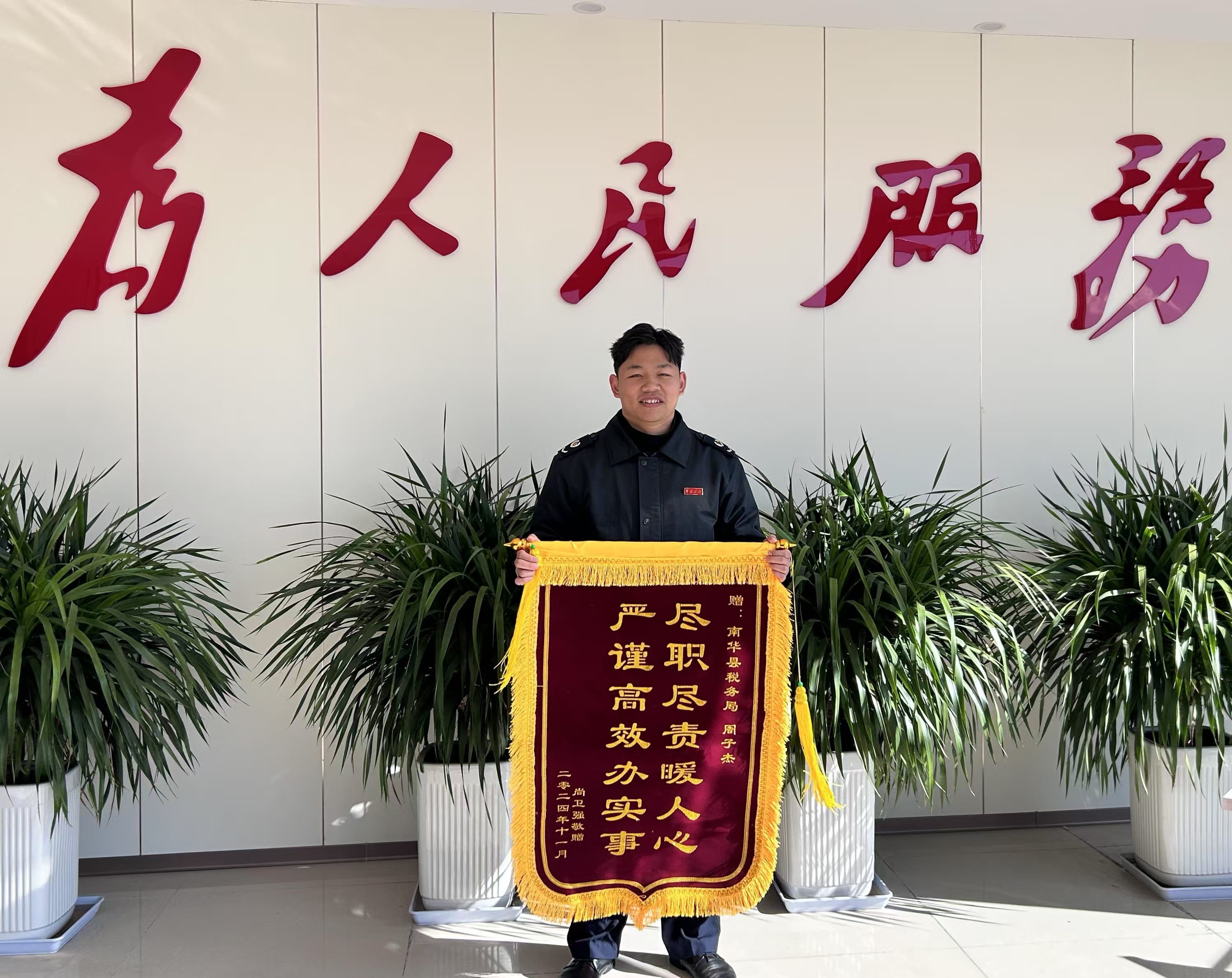 “非常感谢你们,帮我解决了一个大难题,为你们的用心服务点赞!”近日,陕西省咸阳市的尚先生将一面印有“尽职尽责暖人心 严谨高效办实事”的锦旗送到了南华县税务局集约处理中心工作人员手中,向其认真负责、暖心服务表示赞扬和感谢。