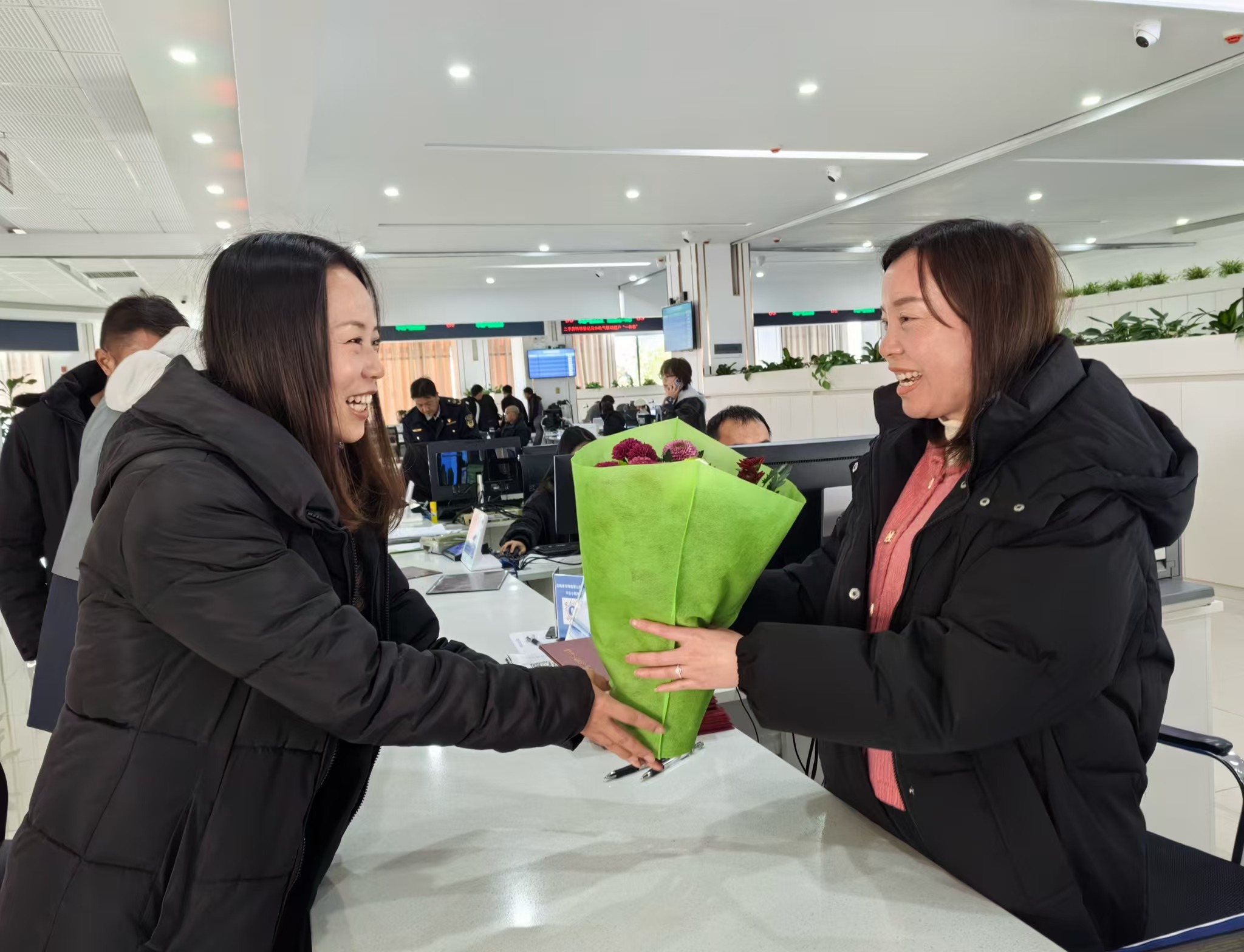2025年1月2日下午,楚雄华兆建设工程有限公司法人李女士将两束鲜花送到南华县政务服务中心综合受理服务区A6窗口和自助办税区两名工作人员手中,对窗口工作人员高度负责的工作态度和热情周到的服务给予表扬与感谢。