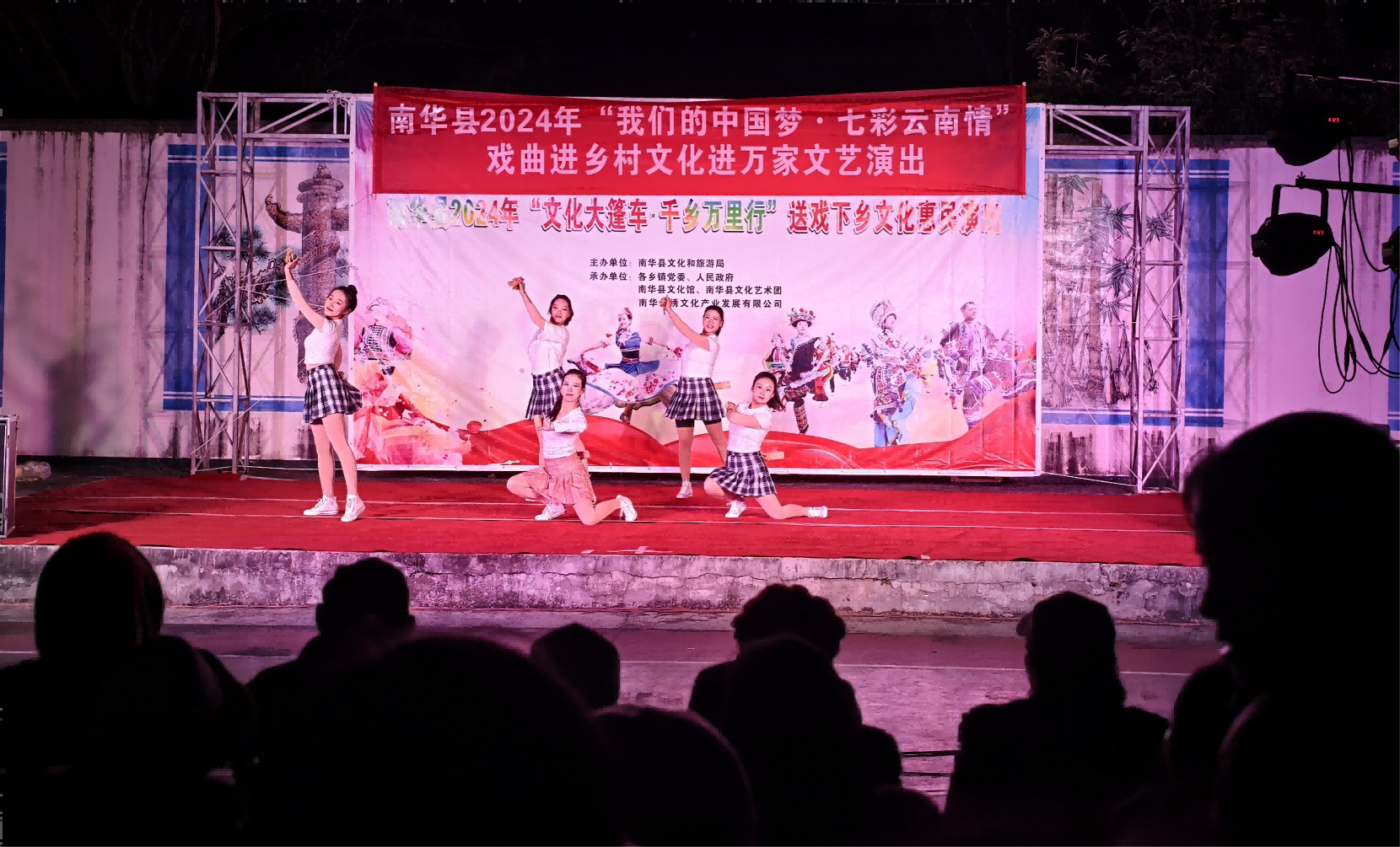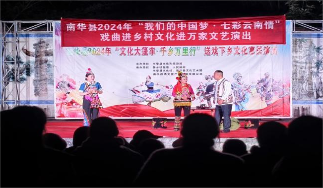 为全面贯彻党的二十大精神,深入学习宣传贯彻习近平文化思想,落实文化惠民工作,更好地满足城乡群众对高品质文化生活的需求。由南华县文化和旅游局主办,南华县文化馆、南华县文化艺术团、南华彝绣文化产业发展有限公司承办的2024年“我们的中国梦·七彩云南情”——“戏曲进乡村”巡回演出活动,于2024年12月2日晚在南华县兔街镇拉开帷幕。