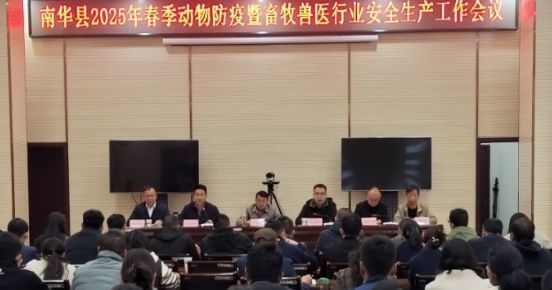 为切实做好春季动物防疫工作,保障畜牧兽医行业安全生产,南华县坚持系统谋划,高位统筹,于3月7日上午召开2025年春季动物防疫暨畜牧兽医行业安全生产工作会议,安排部署全县2025年春季动物防疫、畜牧兽医行业安全生产等畜牧兽医重点工作,结合当前重大动物疫情防控复杂严峻形势,对全县重大动物疫病防控、畜牧产业生产、畜产品安全监管、畜禽粪污资源化利用等重点工作进行再安排、再部署、再落实。县级各有关部门及全县10乡镇分管领导、农业农村发展服务中心工作人员80余人参会。