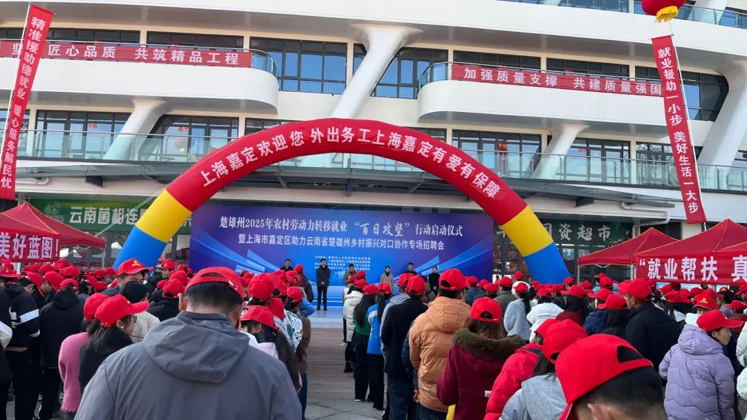 1月8日,楚雄州2025年农村劳动力转移就业“百日攻坚”行动启动仪式暨上海市嘉定区助力云南省楚雄州乡村振兴对口协作专场招聘会在南华县国际野生菌交易中心举办。