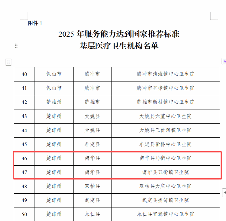 11月11日,云南省卫生健康委发布2025年服务能力达到国家推荐标准基层医疗卫生机构公示中,南华县五街镇卫生院、马街中心卫生院凭借务实举措顺利入选国家推荐标准的卫生院,标志着两家医院在医疗服务能力、公共卫生保障、就医环境改善等核心领域实现质的飞跃,将为辖区群众带来更优质、便捷的医疗卫生服务。