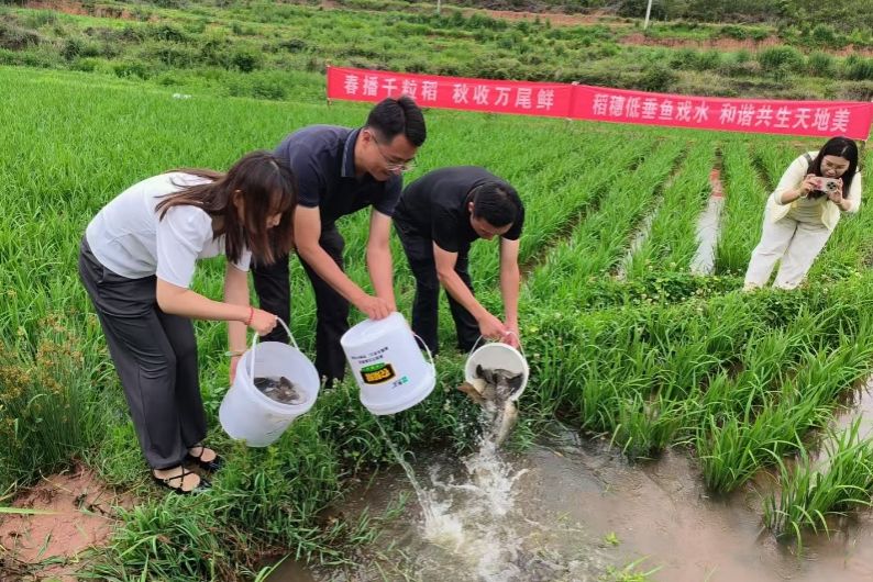 2025年我县向上争取资金30万元,在龙川、沙桥、雨露、罗武庄4个乡镇10个村委会推广稻渔综合种养600亩,每亩投放福瑞鲤鱼苗15-20kg,在龙川江流域实施160亩。培训会现场观摩并投放鱼苗900kg,对稻渔综合种养从田块选择,水源水质、排灌保水、田间工程、防逃逸、鱼苗投放技术要领(鱼苗消毒、水温控制等)、农药施用、日常管理要点、注意事项、稻花鱼米营销等进行了详细讲解。