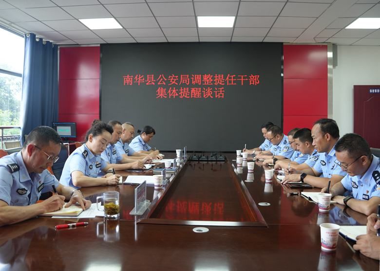 7月7日,南华县公安局对12名调整提任干部进行集体提醒谈话。受县人民政府副县长、县公安局党委书记、局长刘培金委托,党委副书记、政委赵润敏参加会议并作廉政提醒谈话。