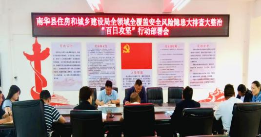 5月14日,南华县住房和城乡建设局召开全领域全覆盖安全风险隐患大排查大整治“百日攻坚”行动部署会议,传达学习习近平总书记关于安全生产的重要指示批示精神,省、州、县安全生产会议精神,对住建领域全领域全覆盖安全风险隐患大排查大整治“百日攻坚”行动作出全面安排部署。