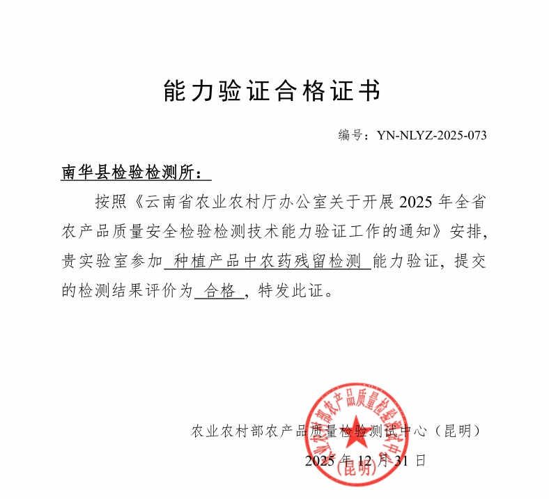 凭借扎实的质量管理体系建设和严谨的检验检测流程,县检验检测所成功通过2025年全省农产品质量安全检验检测技术能力验证,实现连续3年通过该项验证的良好成绩,检测数据公信力与技术服务水平得到权威认可。